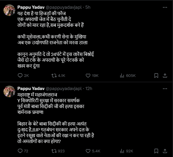 एक अन्य पोस्ट में पप्पू यादव लिखते हैं, ‘यह देश है या हिजड़ों की फौज, एक अपराधी जेल में बैठ चुनौती देकर लोगों को मार रहा है, सब मुकदर्शक बने हैं।कभी मूसेवाला,कभी करणी सेना के मुखिया और अब एक उद्योगपति राजनेता को मरवा डाला। कानून अनुमति दे तो 24 घंटे में इस लारेंस बिश्नोई जैसे दो टके के अपराधी के पूरे नेटवर्क को खत्म कर दूंगा (Pappu Yadav challenge to Lawrence Bishnoi)।’